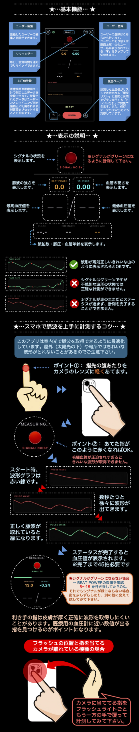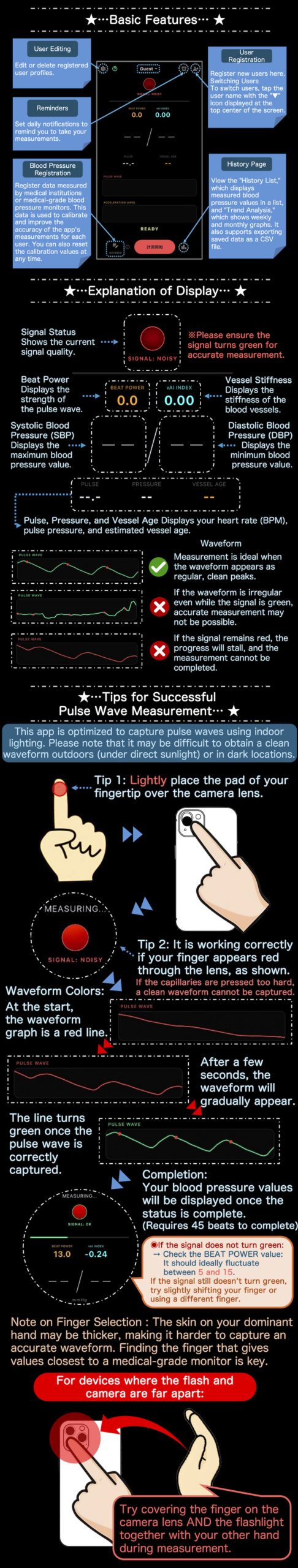 本アプリは、スマートフォンのカメラとフラッシュのみを使用して指先の**脈波(Pulse Wave)**をリアルタイムで解析し、血圧推定・血管年齢・ストレス指標などを可視化するヘルスケア・モニタリングツールです。専用ハードウェアを必要とせず、日常的な健康管理をサポートします。