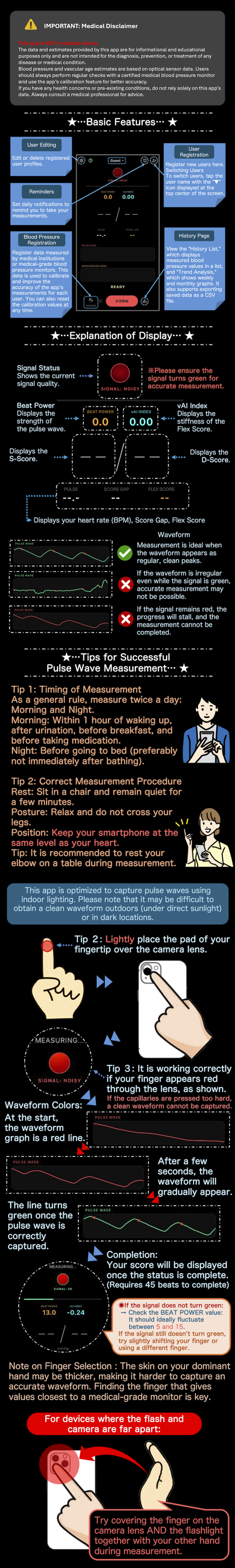 本アプリは、スマートフォンのカメラとフラッシュのみを使用して指先の**脈波(Pulse Wave)**をリアルタイムで解析し、血圧推定・血管年齢・ストレス指標などを可視化するヘルスケア・モニタリングツールです。専用ハードウェアを必要とせず、日常的な健康管理をサポートします。